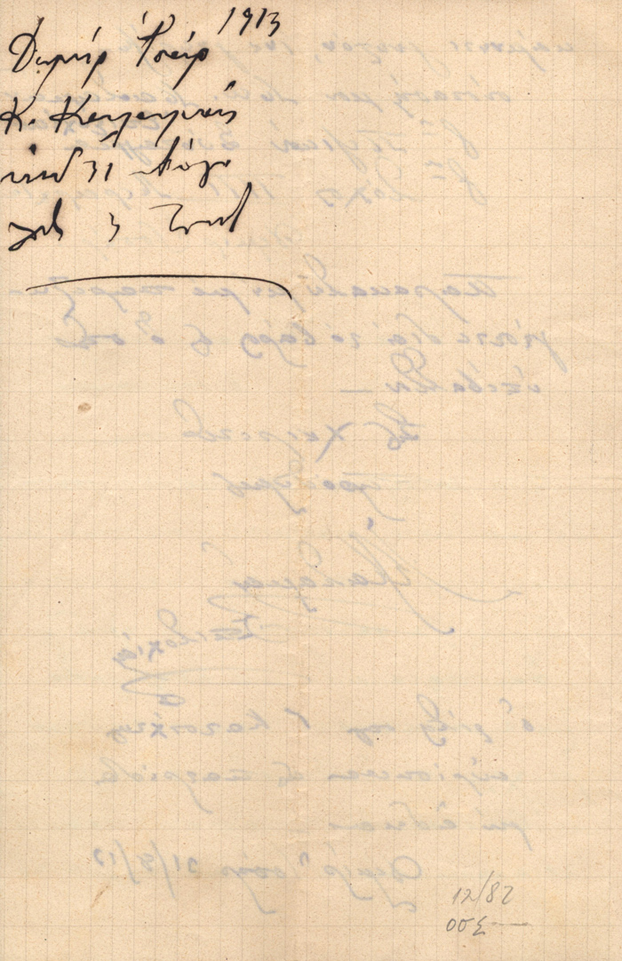 Οπόταν δέ πράγματι λάβητε τοιαύτην σας παρακαλώ να το κάμνητε γνωστόν, ίνα γνωρίζω. Σύστασίς μου Κων. Καλαμάν Επιλοχίαν