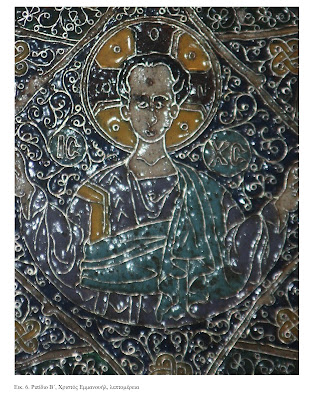 Αποδίδεται ως νέος, αγένειος, με καστανή κόμη, ευλογώντας με τα δύο χέρια (εικ. 6). Είναι ενδεδυμένος με ιώδες ιμάτιο και γαλάζιο μανδύα. Εκατέρωθεν της κεφαλής του εντάσσονται δύο μετάλλια, συμπληρωμένα με γαλάζιο σμάλτο, όπου αναγράφεται Ι(ΗCΟΥ)C / Χ(ΡΙCΤΟ)C. Στο χρυσό φωτοστέφανο εγγράφεται σταυρός με βαθυκόκκινες κεραίες, όπου διακρίνεται η επιγραφή Ο/Ω/Ν. Το βάθος της επιφάνειας πληρούται με φυτική διακόσμηση, αποτελούμενη από έλικες με λεπτό σύρμα.